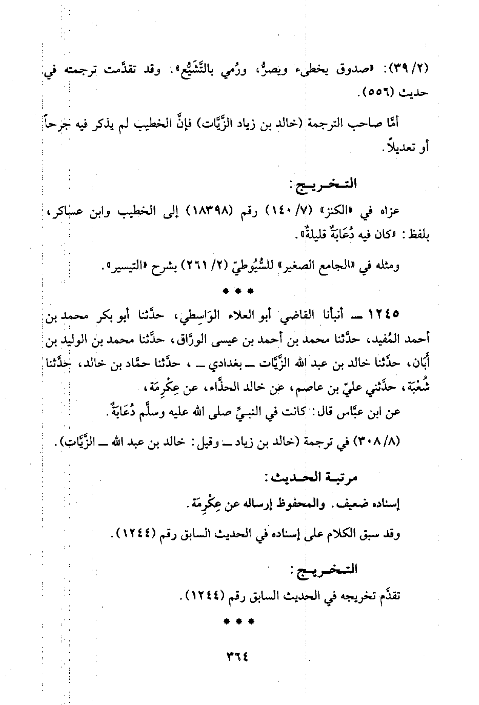 ١٢٤٥ - أنبأنا القاضي أبو العلاء الوَاسِطي، حدَّثنا أبو بكر محمد بن أحمد المُفيد، حدَّثنا محمد بن أحمد بن عيسى الورَّاق، حدَّثنا محمد بن الوليد بن أَبَان، حدَّثنا خالد بن عبد اللَّه الزَّيَّات -بغدادي-، حدَّثنا حمَّاد بن خالد، حدَّثنا شُعْبَة، حدثتني عليّ بن عاصم، عن خالد الحذَّاء، عن عِكْرِمَة،