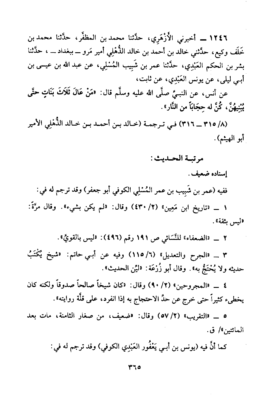 ١٢٤٦ - أخبرني الأَزْهَرِي، حدَّثنا محمد بن المظفَّر، حدَّثنا محمد بن خلف وكيع، حدَّثني خالد بن أحمد بن خالد الذُّهْلِي أمير مَرو -ببغداد-، حدَّثنا بشر بن الحكم العَبْدِي، حدَّثنا عمر بن شَبِيب المُسْلِي، عن عبد اللَّه بن عيسى بن أبي ليلى، عن يونس العَبْدِي، عن ثابت،