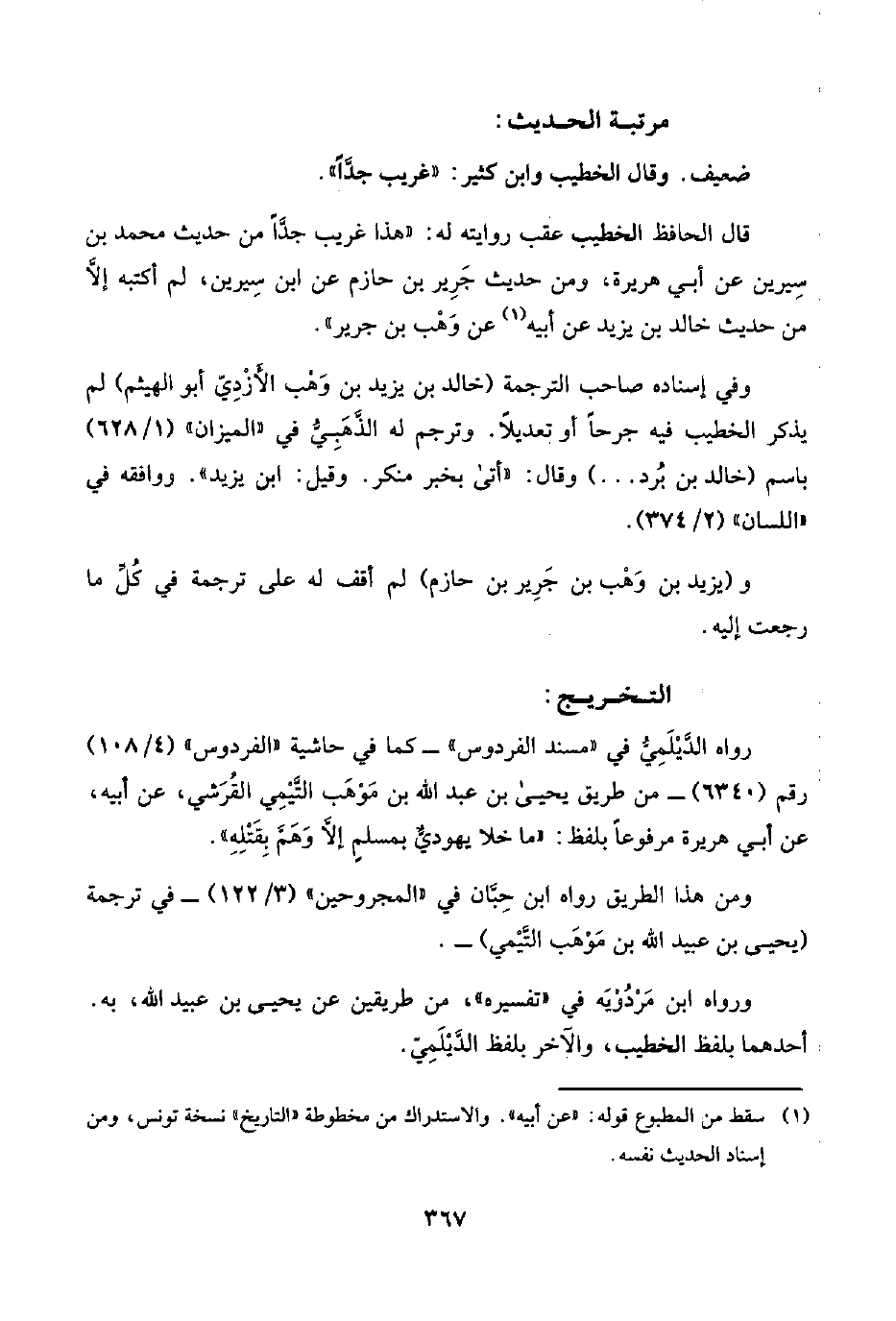 قال الحافظ الخطيب عقب روايته له: "هذا غريب جدًّا من حديث محمد بن سِيرين عن أبي هريرة، ومن حديث جَرِير بن حازم عن ابن سِيرين، لم أكتبه إلَّا من حديث خالد بن يزيد عن أبيه (¬١)، عن وَهْب بن جرير".