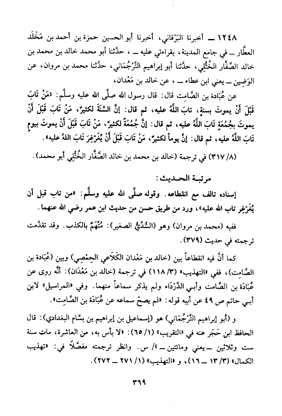 ١٢٤٨ - أخبرنا البَرْقاني، أخبرنا أبو الحسين حمزة بن أحمد بن مَخْلَد العطَّار -في جامع المدينة، بقراءتي عليه-، حدَّثنا أبو محمد خالد بن محمد بن خالد الصَّفَّار الخُتُّلِي، حدَّثنا أبو إبراهيم التَّرْجُمَاني، حدَّثنا محمد بن مروان، عن الوَضِين -يعني ابن عطاء-، عن خالد بن مَعْدان،