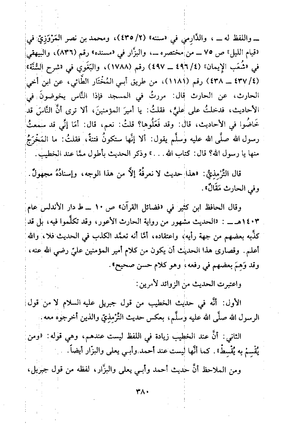 وقال الحافظ ابن كثير في "فضائل القرآن" ص ١٠ - ط دار الأندلس عام ١٤٠٣ هـ-: "الحديث مشهور من رواية الحارث الأعور، وقد تكلَّموا فيه، بل قد كذَّبه بعضهم من جهة رأيه، واعتقاده، أمَّا أنَّه تعمَّد الكذب في الحديث فلا، واللَّهُ أعلم. وقصارى هذا الحديث أن يكون من كلام أمير المؤمنين عليّ رضي اللَّه عنه، وقد وَهِمَ بعضهم في رفعه، وهو كلام حسن صحيح".