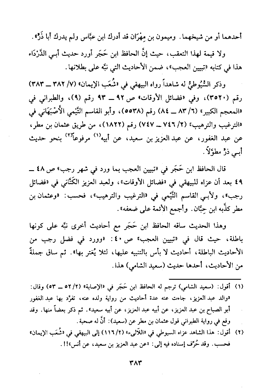 وهذا الحديث ساقه الحافظ ابن حَجَر مع أحاديث أخرى نبَّه على كونها باطلة، حيث قال في "تبيين العجب" ص ٤٠: "وورد في فضل رجب من الأحاديث الباطلة، أحاديث لا بأس بالتنبيه عليها، لئلا يُغتر بها". ثم ساق جملةً من الأحاديث، أحدها حديث (سعيد الشامي) هذا.