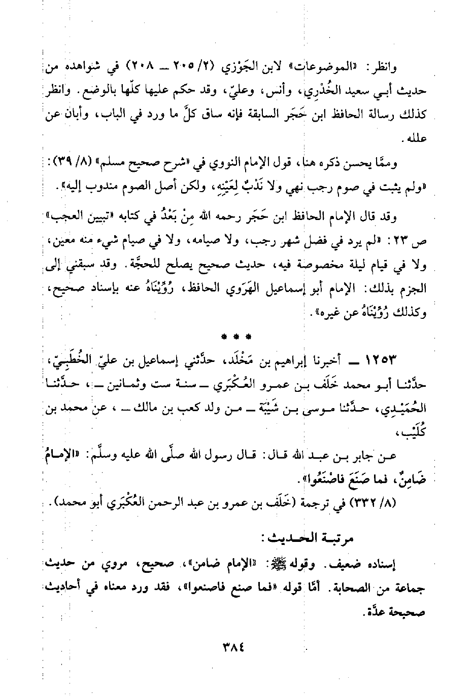 عن جابر بن عبد اللَّه قال: قال رسول اللَّه صلَّى اللَّه عليه وسلَّم: "الإِمامُ ضَامِنٌ، فما صَنَعَ فاصْنَعُوا".