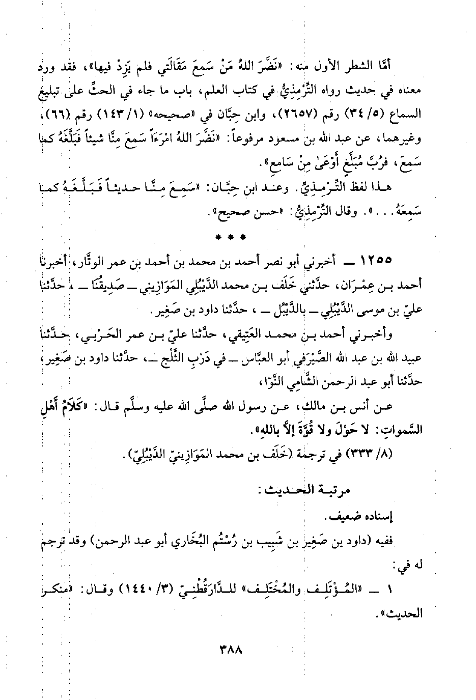 ١٢٥٥ - أخبرني أبو نصر أحمد بن محمد بن أحمد بن عمر الوتَّار، أخبرنا أحمد بن عِمْران، حدَّثني خَلَف بن محمد الدَّيْبُلِي المَوَازِيني -صَدِيقُنَا-، حدَّثنا عليّ بن موسى الدَّيْبُلِي -بالدَّيْبُل-، حدَّثنا داود بن صَغِير.