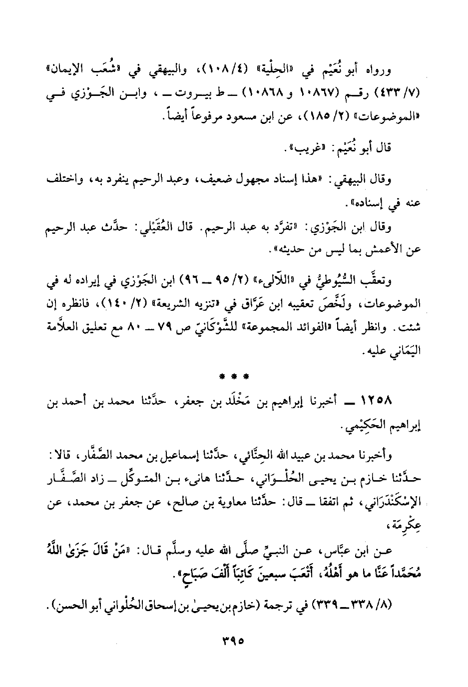 وتَعَقَّبَ السُّيُوطيُّ في "اللآلئ" (٢/ ٩٥ - ٩٦) ابن الجَوْزي في إيراده له في الموضوعات، ولَخَّصَ تعقيبه ابن عَرَّاق في "تنزيه الشريعة" (٢/ ١٤٠)، فانظره إن شئت. وانظر أيضًا "الفوائد المجموعة" للشَّوْكَانِيّ ص ٧٩ - ٨٠ مع تعليق العلَّامة اليَمَاني عليه.
