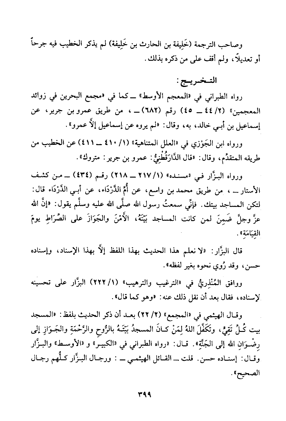 وقال الهيثمي في "المجمع" (٢/ ٢٢) بعد أن ذكر الحديث بلفظ: "المسجد بيت كُلِّ تَقِيٍّ، وتَكَفَّلَ اللَّهُ لِمَنْ كانَ المسجدُ بَيْتَهُ بالرُّوحِ والرَّحْمَةِ والجَوَازِ إلى رِضْوَانِ اللَّه إلى الجَنَّةِ". قال: "رواه الطبراني في "الكبير" و"الأوسط" والبزَّار وقال: إسناده حسن. قلت -القائل الهيثمي-: ورجال البزَّار كلُّهم رجال الصحيح".
