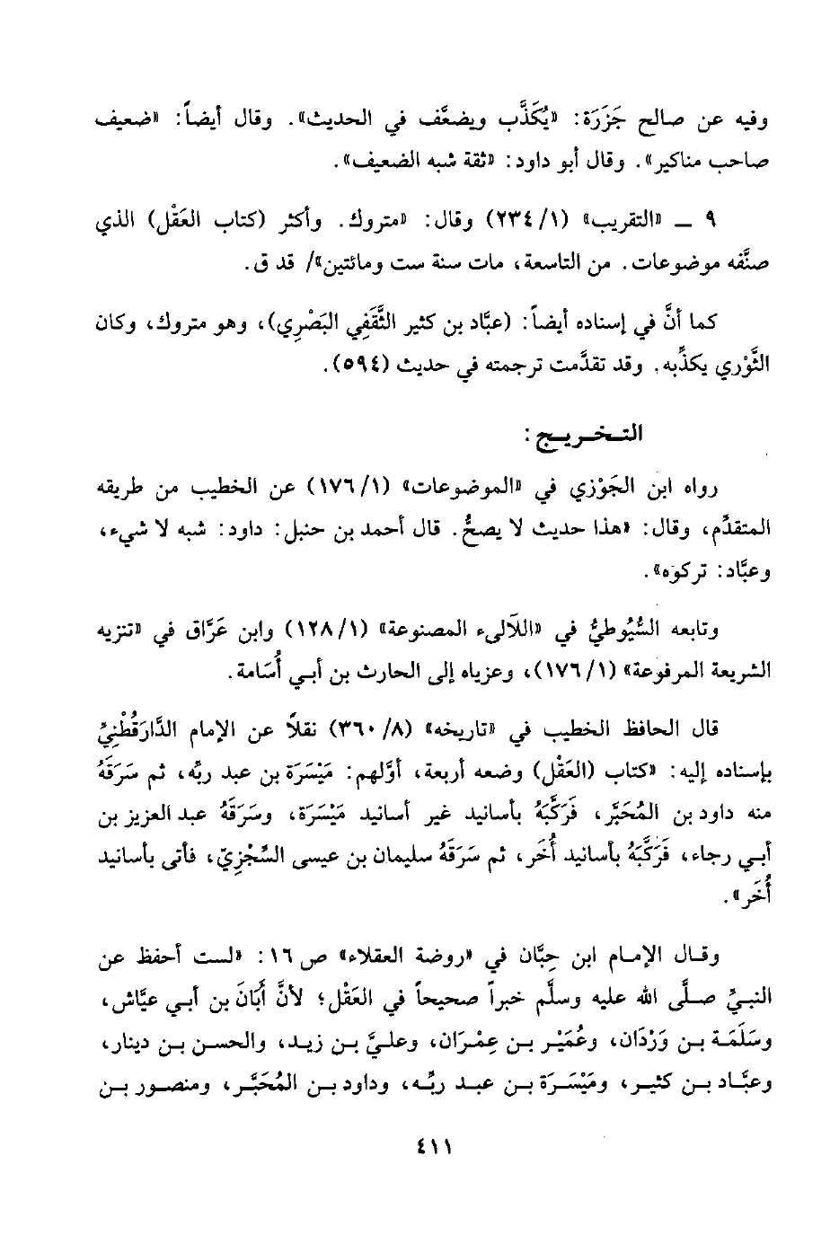 وقال الإمام ابن حِبَّان في "روضة العقلاء" ص ١٦: "لست أحفظ عن النبيِّ صلَّى اللَّه عليه وسلَّم خبرًا صحيحًا في العَقْل؛ لأنَّ أَبَانَ بن أبي عيَّاش، وسَلَمَة بن وَرْدَان، وعُمَيْر بن عِمْرَان، وعليَّ بن زيد، والحسن بن دينار، وعبَّاد بن كثير، ومَيْسَرَة بن عبد ربِّه، وداود بن المُحَبَّر، ومنصور بن