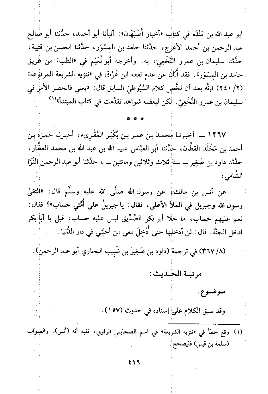 (¬١) وقع خطأ في "تنزيه الشريعة" في اسم الصحابي الراوي، ففيه أنه (أنس). والصواب (سلمة بن قيس) فليصحح.