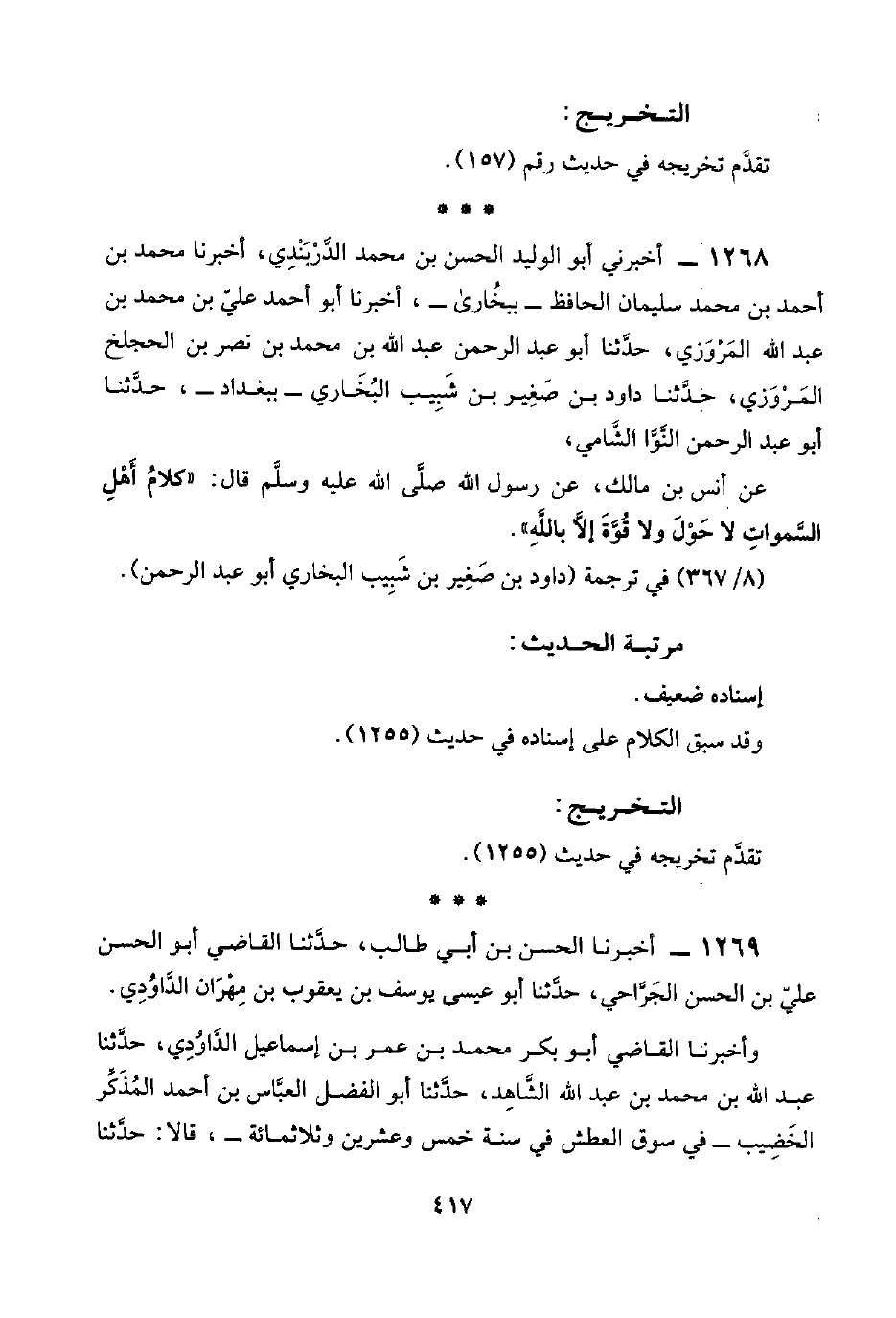 ١٢٦٨ - أخبرني أبو الوليد الحسن بن محمد الدَّرْبَنْدِي، أخبرنا محمد بن أحمد بن محمد سليمان الحافظ -ببخُارى-، أخبرنا أبو أحمد عليّ بن محمد بن عبد اللَّه المَرْوَزي، حدثنا أبو عبد الرحمن عبد اللَّه بن محمد بن نصر بن الحجلخ المَرْوَزي، حدَّثنا داود بن صَغِير بن شَبِيب البُخَاري -ببغداد-، حدَّثنا أبو عبد الرحمن النَّوَّا الشَّامي،