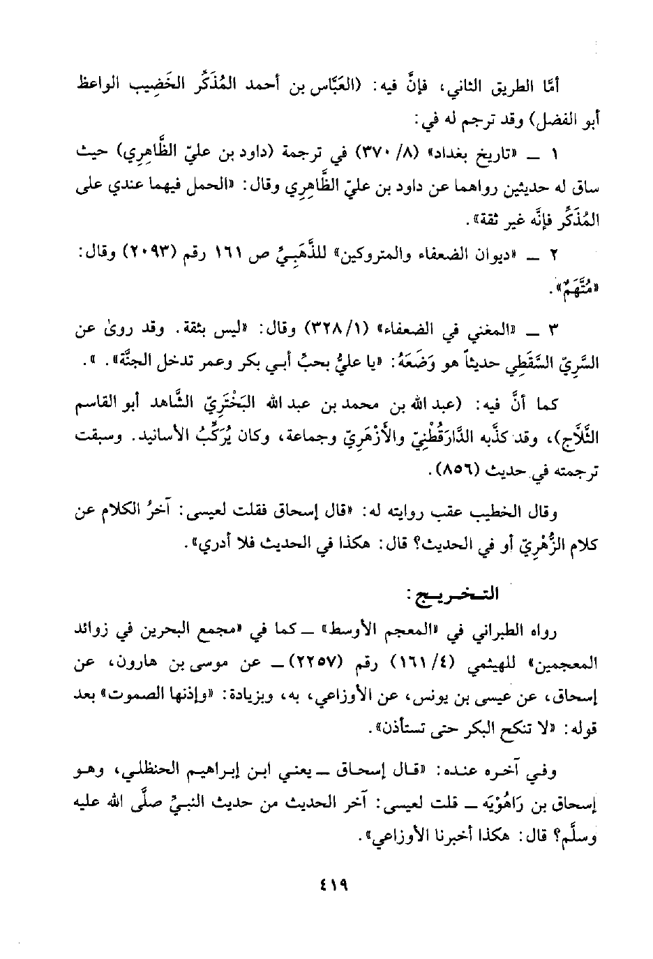 ١ - "تاريخ بغداد" (٨/ ٣٧٠) في ترجمة (داود بن عليّ الظَّاهِرِي) حيث ساق له حديثين رواهما عن داود بن عليّ الظَّاهِرِي وقال: "الحمل فيهما عندي على المُذَكِّر فإنَّه غير ثقة".