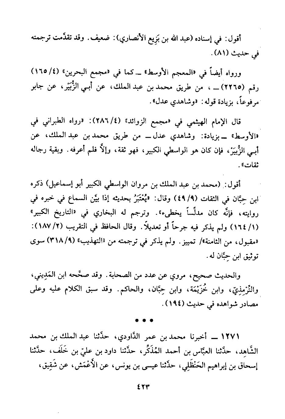 ١٢٧١ - أخبرنا محمد بن عمر الدَّاودي، حدَّثنا عبد الملك بن محمد الشَّاهِد، حدَّثنا العبَّاس بن أحمد المُذَكِّر، حدَّثنا داود بن عليّ بن خَلَف، حدَّثنا إسحاق بن إبراهيم الحَنْظَلِي، حدَّثنا عيسى بن يونس، عن الأَعْمَش، عن شَقِيق،