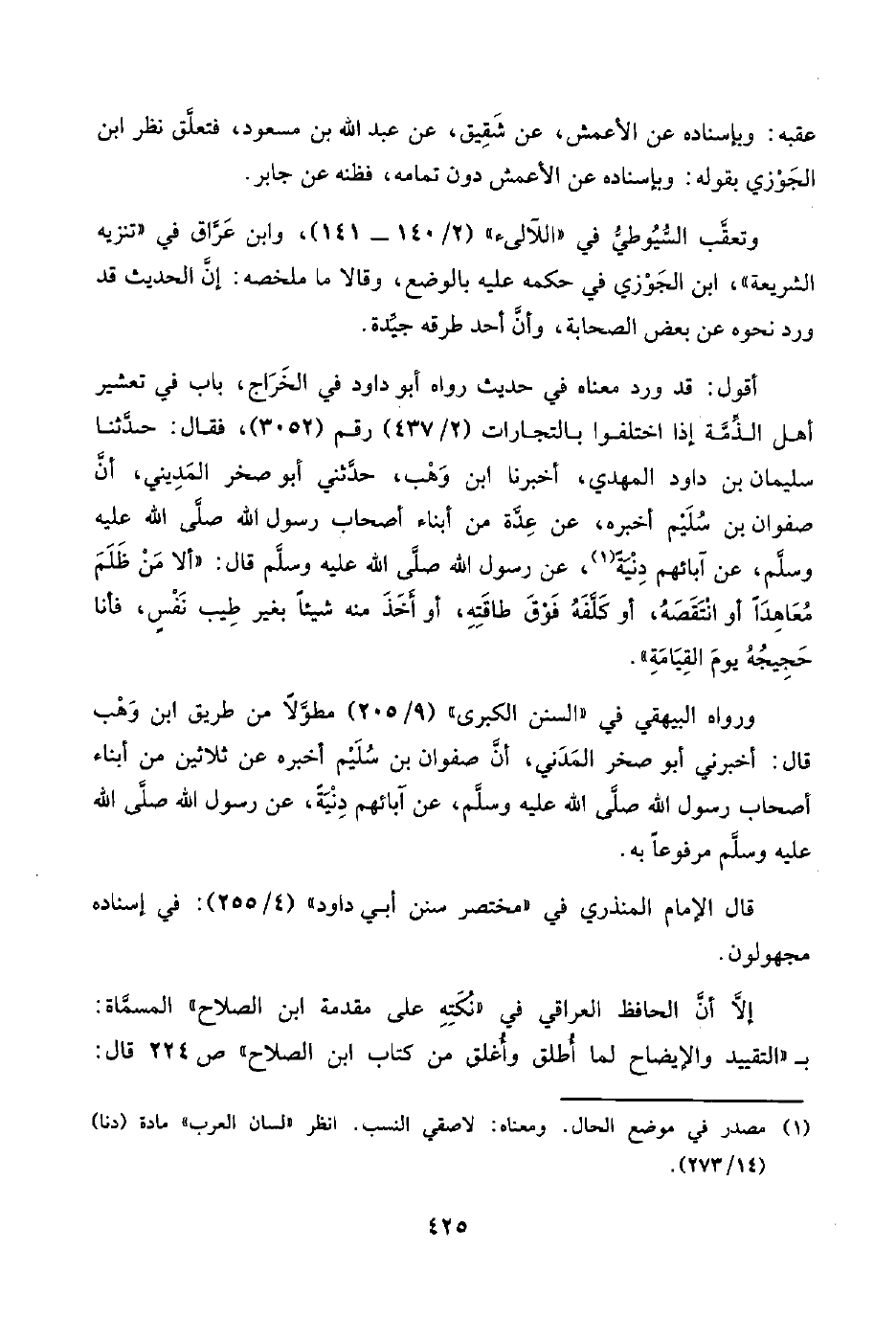 أقول: قد ورد معناه في حديث رواه أبو داود في الخَرَاج، باب في تعشير أهل الذِّمَّة إذا اختلفوا بالتجارات (٢/ ٤٣٧) رقم (٣٠٥٢)، فقال: حدثنا سليمان بن داود المهدي، أخبرنا ابن وَهْب، حدَّثني أبو صخر المَدِيني، أنَّ صفوان بن سُلَيْم أخبره، عن عِدَّة من أبناء أصحاب رسول اللَّه صلَّى اللَّه عليه وسلَّم، عن آبائهم دِنْيَةً (¬١)، عن رسول اللَّه صلَّى اللَّه عليه وسلَّم قال: "ألا مَنْ ظَلَمَ مُعَاهِدًا أو انْتَقَصَهُ، أو كَلَّفَهُ فَوْقَ طاقَتِهِ، أو أَخَذَ منه شيئًا بغير طِيب نَفْسٍ، فأنا حَجِيجُهُ يومَ القِيَامِة".
