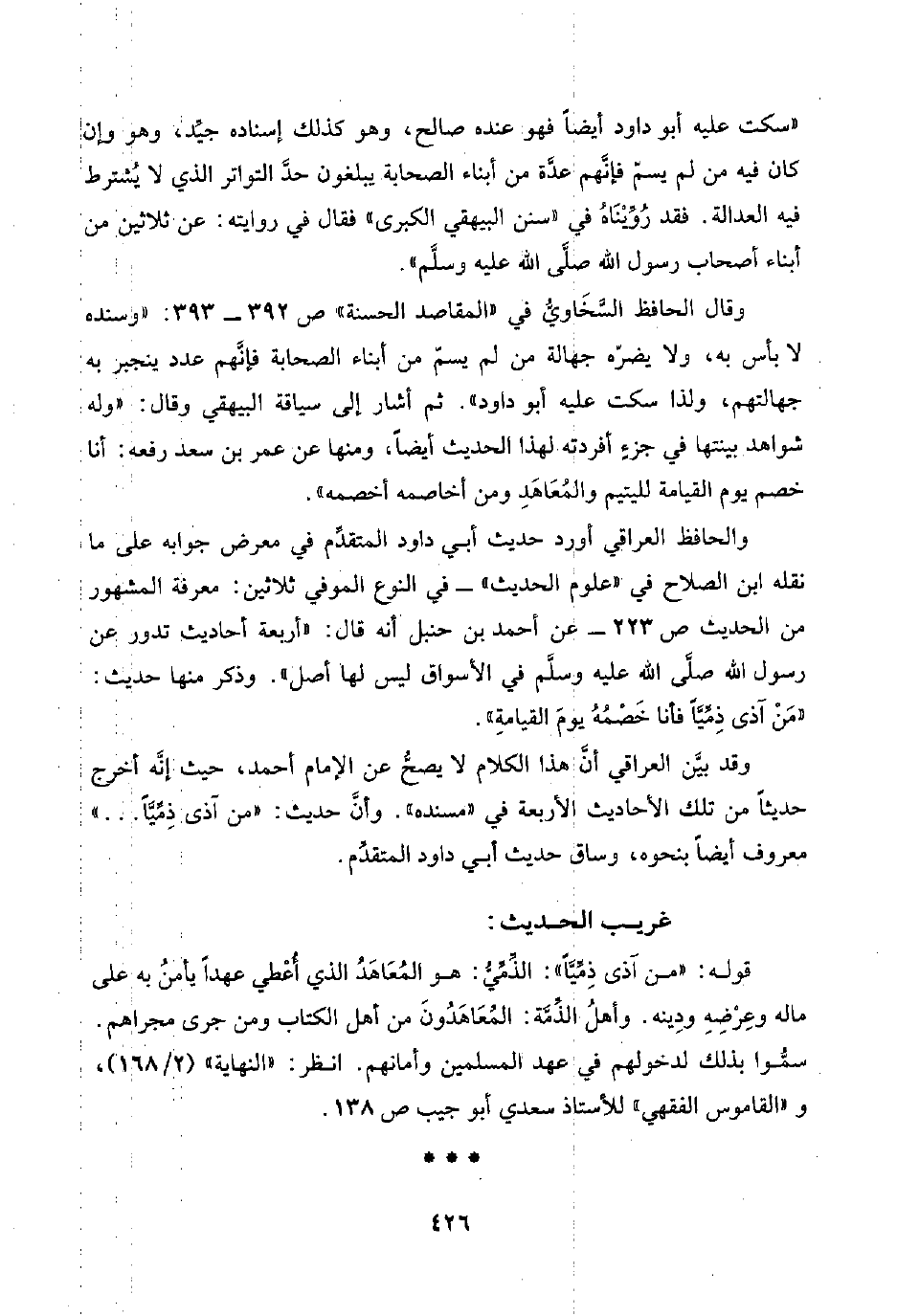 وقال الحافظ السَّخَاويُّ في "المقاصد الحسنة" ص ٣٩٢ - ٣٩٣: "وسنده لا بأس به، ولا يضره جهالة من لم يسمّ من أبناء الصحابة فإنَّهم عدد ينجبر به جهالتهم، ولذا سكت عليه أبو داود". ثم أشار إلى سياقة البيهقي وقال: "وله شواهد بينتها في جزء أفردته لهذا الحديث أيضًا، ومنها عن عمر بن سعد رفعه: أنا خصم يوم القيامة لليتيم والمُعَاهَدِ ومن أخاصمه أخصمه".
