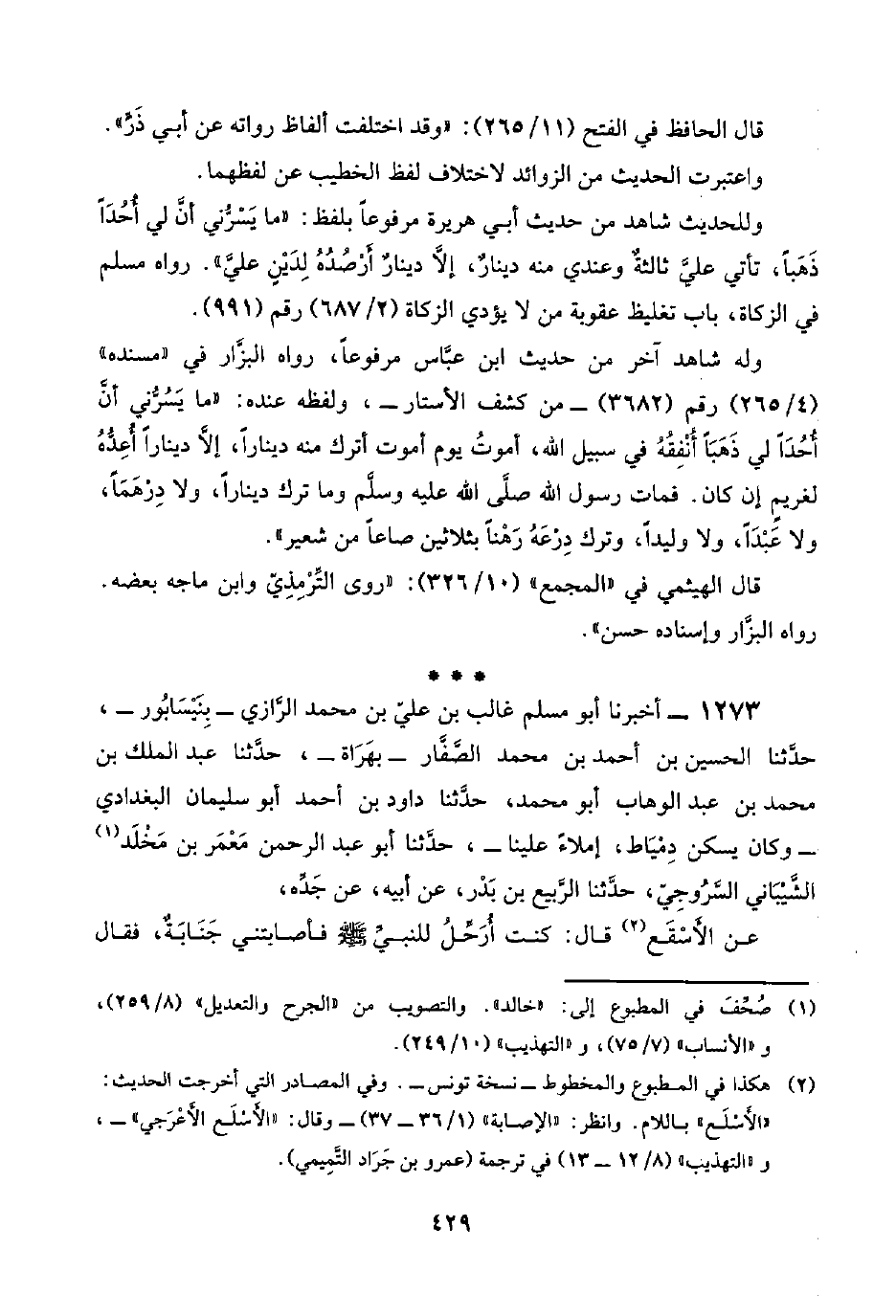 ١٢٧٣ - أخبرنا أبو مسلم غالب بن عليّ بن محمد الرَّازي -بِنَيْسَابُور-، حدَّثنا الحسين بن أحمد بن محمد الصَّفَّار -بهَرَاة-، حدَّثنا عبد الملك بن محمد بن عبد الوهاب أبو محمد، حدَّثنا داود بن أحمد أبو سليمان البغدادي -وكان يسكن دِمْيَاط، إملاءً علينا-، حدَّثنا أبو عبد الرحمن مَعْمَر بن مَخْلَد (¬١) الشَّيْبَاني السَّرُوجيّ، حدَّثنا الرَّبيع بن بَدْر، عن أبيه، عن جَدِّه،
