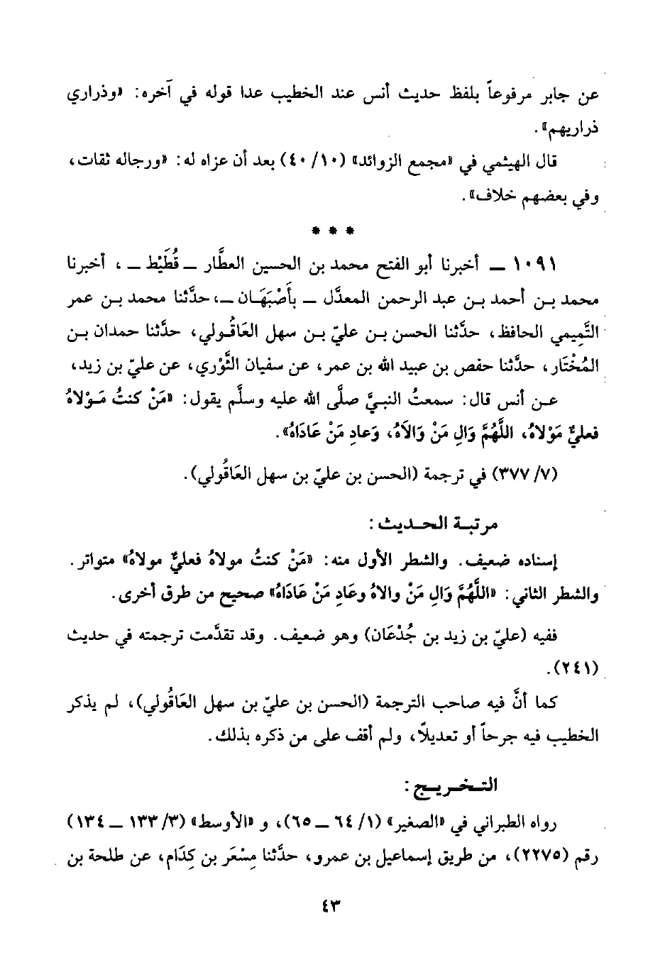 ١٠٩١ - أخبرنا أبو الفتح محمد بن الحسين العَطَّار -قُطَيْط-، أخبرنا محمد بن أحمد بن عبد الرحمن المعدَّل -بأَصْبَهَان-، حدَّثنا محمد بن عمر التَّمِيمي الحافظ، حدَّثنا الحسن بن عليّ بن سهل العَاقُولي، حدَّثنا حمدان بن المُخْتَار، حدَّثنا حفص بن عبيد اللَّه بن عمر، عن سفيان الثَّوْري، عن عليّ بن زيد،
