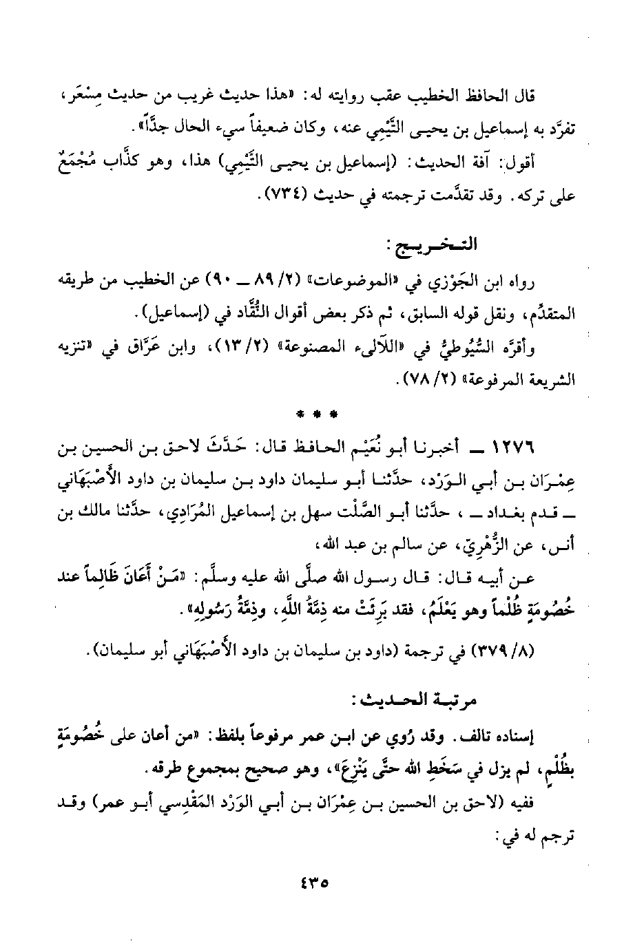 ١٢٧٦ - أخبرنا أبو نُعَيم الحافظ قال: حَدَّثَ لاحق بن الحسين بن عِمْرَان بن أبي الوَرْد، حدَّثنا أبو سليمان داود بن سليمان بن داود الأَصْبَهَاني -قدم بغداد-، حدَّثنا أبو الصَّلْت سهل بن إسماعيل المُرَادِي، حدَّثنا مالك بن أنس، عن الزُّهْرِيّ، عن سالم بن عبد اللَّه،