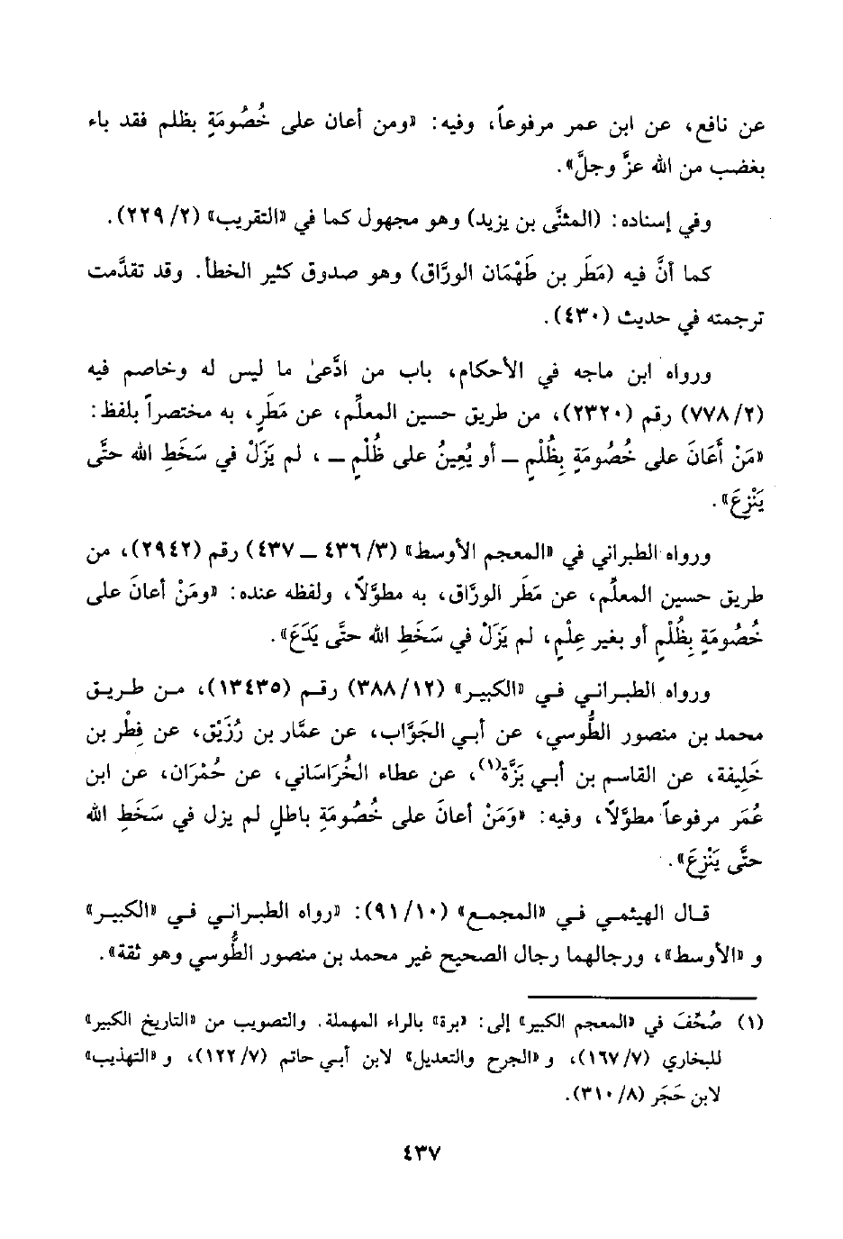 ورواه الطبراني في "الكبير" (١٢/ ٣٨٨) رقم (١٣٤٣٥)، من طريق محمد بن منصور الطُّوسي، عن أبي الجَوَّاب، عن عمَّار بن رُزَيْق، عن فِطْر بن خَلِيفة، عن القاسم بن أبي بَزَّة (¬١)، عن عطاء الخُرَاسَاني، عن حُمْرَان، عن ابن عُمَر مرفوعًا مطوَّلًا"، وفيه: "ومَنْ أعانَ على خُصُومَةِ باطلٍ باطل لم يزل في سَخَطِ اللَّه حتَّى يَنْزِعَ".