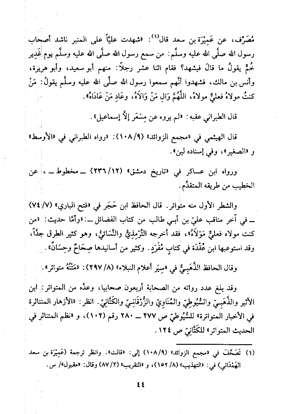 مُصَرِّف، عن عَمِيْرَة بن سعد قال (¬١): "شهدت عليًّا على المنبر ناشد أصحاب رسول اللَّه صلَّى اللَّه عليه وسلَّم: من سمع رسول اللَّه صلَّى اللَّه عليه وسلَّم يوم غَدِير خُمٍّ يقولُ ما قالَ فيشهد؟ فقام اثنا عشر رجلًا: منهم أبو سعيد، وأبو هريرة، وأنس بن مالك، فشهدوا أنَّهم سمعوا رسول اللَّه صلَّى اللَّه عليه وسلَّم يقولُ: مَنْ كنتُ مولاهُ فعليٌّ مولاهُ، اللَّهُمَّ وَالِ مَنْ وَالَاهُ، وعَادِ مَنْ عَادَاهُ".