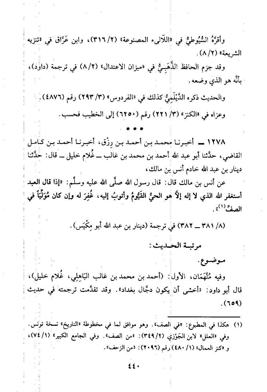 وفيه مُتَّهَمَان، الأول: (أحمد بن محمد بن غالب البَاهِلِي، غُلام خليل)، قال أبو داود: "أخشى أن يكون دجَّال بغداد". وقد تقدَّمت ترجمته في حديث (٦٥٩).