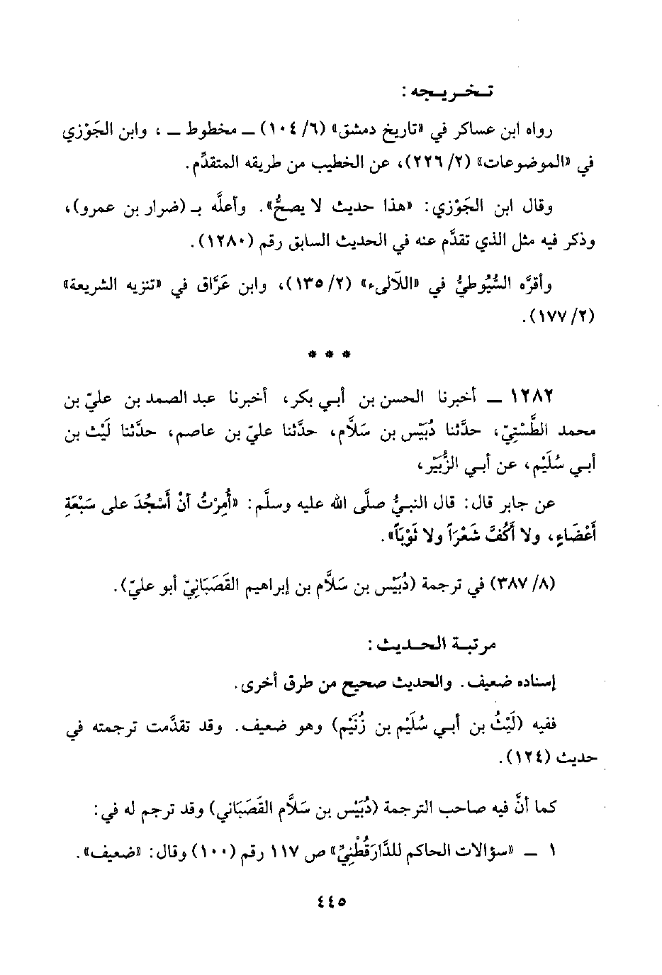وقال ابن الجَوْزي: "هذا حديث لا يصحُّ". وأعلَّه بـ (ضرار بن عمرو)، وذكر فيه مثل الذي تقدَّم عنه في الحديث السابق رقم (١٢٨٠).