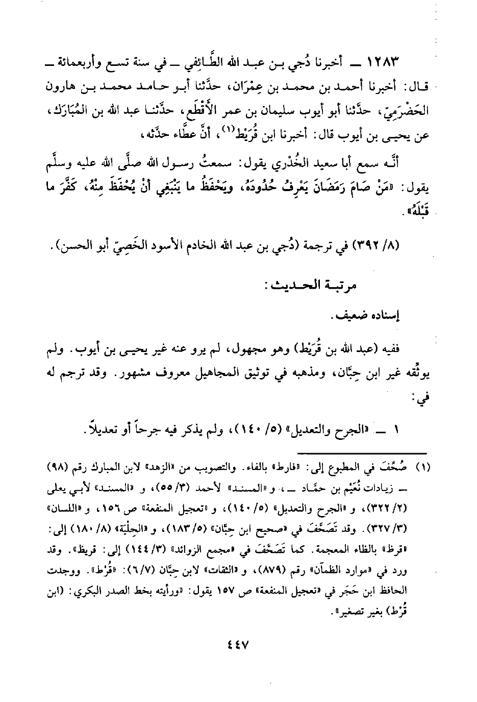 ١٢٨٣ - أخبرنا دُجي بن عبد اللَّه الطَّائِفي -في سنة تسع وأربعمائة- قال: أخبرنا أحمد بن محمد بن عِمْرَان، حدَّثنا أبو حامد محمد بن هارون الحَضْرَمِيّ، حدَّثنا أبو أيوب سليمان بن عمر الأَقْطَع، حدَّثنا عبد اللَّه بن المُبَارَك، عن يحيى بن أيوب قال: أخبرنا ابن قُرَيْط (¬١)، أنَّ عطَّاء حدَّثه،