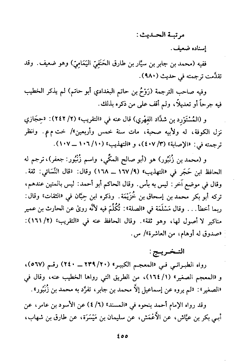 رواه الطبراني في "المعجم الكبير" (٢٠/ ٢٣٩ - ٢٤٠) رقم (٥٦٧)، و"المعجم الصغير" (١/ ١٦٤)، من الطريق التي رواها الخطيب عنه، وقال في "الصغير": "لم يروه عن إسماعيل إلَّا محمد بن جابر، تفرَّد به محمد بن زُنْبُور".