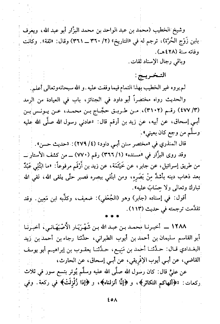١٢٨٨ - أخبرنا محمد بن عبد اللَّه بن شَهْرَيَار الأصَبَهَاني، أخبرنا أبو القاسم سليمان بن أحمد بن أيوب الطبراني، حدَّثنا رجاء بن أحمد بن زيد البغدادي قال: حدَّثنا أحمد بن مَنِيع، حدَّثنا يعقوب بن إبراهيم أبو يوسف القاضي، عن أبي أيوب الإفْرِيقي، عن أبي إسحاق، عن الحارث،