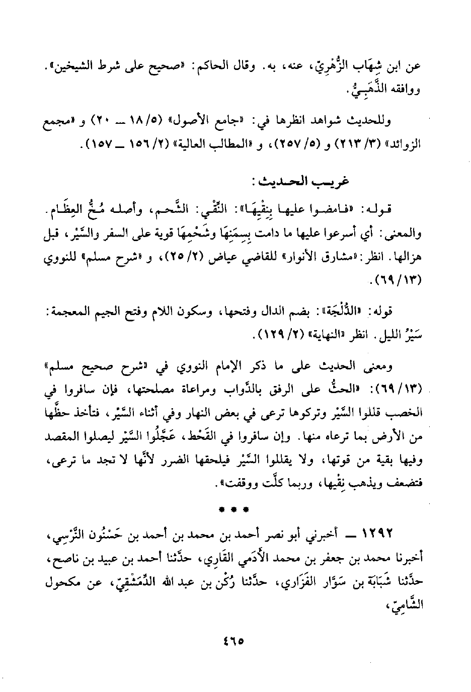 ومعنى الحديث على ما ذكر الإِمام النَّووي في "شرح صحيح مسلم" (١٣/ ٦٩): "الحثُّ على الرفق بالدَّواب ومراعاة مصلحتها، فإن سافروا في الخصب قللوا السَّيْر وتركوها ترعي في بعض النهار وفي أثناء السِّيَر، فتأخذ حظَّها من الأرض بما ترعاه منها. وإن سافروا في القَحْط، عَجَّلُوا السِّيَر ليصلوا المقصد وفيها بقية من قوتها، ولا يقللوا السِّيَر فيلحقها الضرر لأنَّها لا تجد ما ترعى، فتضعف ويذهب نِقْيها، وربما كلَّت ووقفت".
