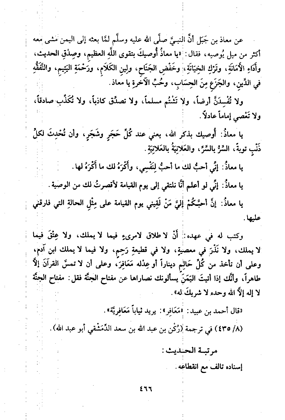 وكتب له في عهده: أَنْ لا طلاق لامرئٍ فيما لا يملك، ولا عِتْقَ فيما لا يملك، ولا نَذْرَ في معصيةٍ، ولا في قطيعةِ رَحِمٍ، ولا فيما لا يملك ابن آدم، وعلى أن تأخذ من كُلِّ حَالِمٍ دينارًا أو عِدْله مَعَافِرَ، وعلى أن لا تمسَّ القرآنَ إلَّا طاهرًا، وأنَّك إذا أتيت اليَمَنَ يسألونك نصاراها عن مفتاح الجَنَّة فقل: مفتاح الجَنَّة لا إله إلَّا اللَّه وحده لا شريكَ له".