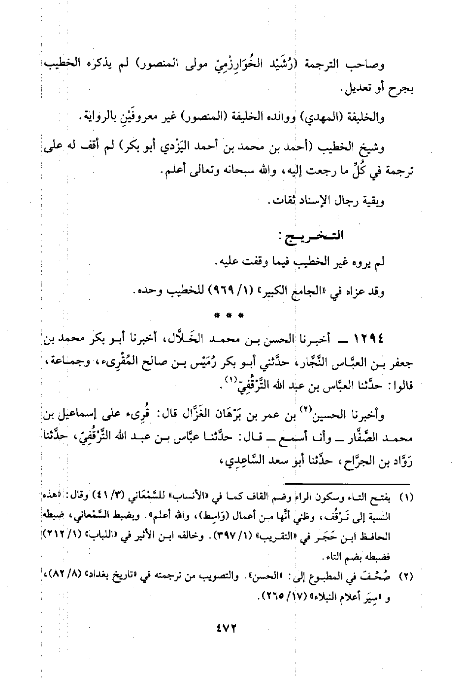 ١٢٩٤ - أخبرنا الحسن بن محمد الخَلَّال، أخبرنا أبو بكر محمد بن جعفر بن العبَّاس النَّجَّار، حدَّثني أبو بكر رُمَيْس بن صالح المُقْرِئ، وجماعة، قالوا: حدَّثنا العبَّاس بن عبد اللَّه التَّرْقُفِيّ (¬١).