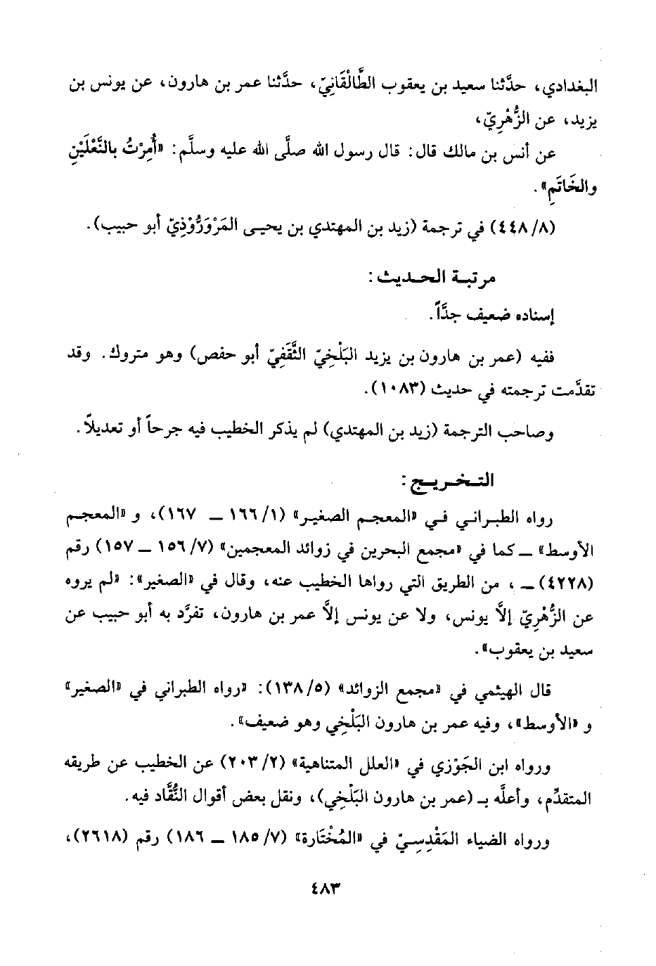 رواه الطبراني في "المعجم الصغير" (١/ ١٦٦ - ١٦٧)، و"المعجم الأوسط" -كما في "مجمع البحرين في زوائد المعجمين" (٧/ ١٥٦ - ١٥٧) رقم (٤٢٢٨) -، من الطريق التي رواها الخطيب عنه، وقال في "الصغير": "لم يروه عن الزُّهْرِيّ إلَّا يونس، ولا عن يونس إلَّا عمر بن هارون، تفرَّد به أبو حبيب عن سعيد بن يعقوب".