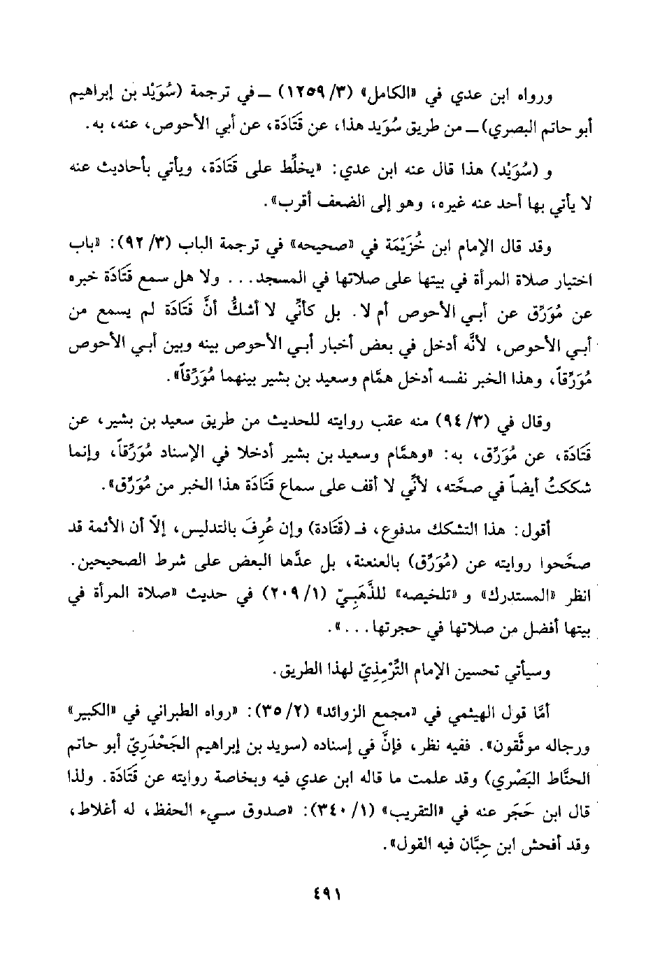 أمَّا قول الهيثمي في "مجمع الزوائد" (٢/ ٣٥): "رواه الطبراني في "الكبير" ورجاله موثَّقون". ففيه نظر، فإنَّ في إسناده (سويد بن إبراهيم الجَحْدَرِيّ أبو حاتم الحنَّاط البَصْري) وقد علمت ما قاله ابن عدي فيه وبخاصة روايته عن قَتَادَة. ولذا قال ابن حَجَر عنه في "التقريب" (١/ ٣٤٠): "صدوق سيء الحفظ، له أغلاط، وقد أفحش ابن حِبَّان فيه القول".