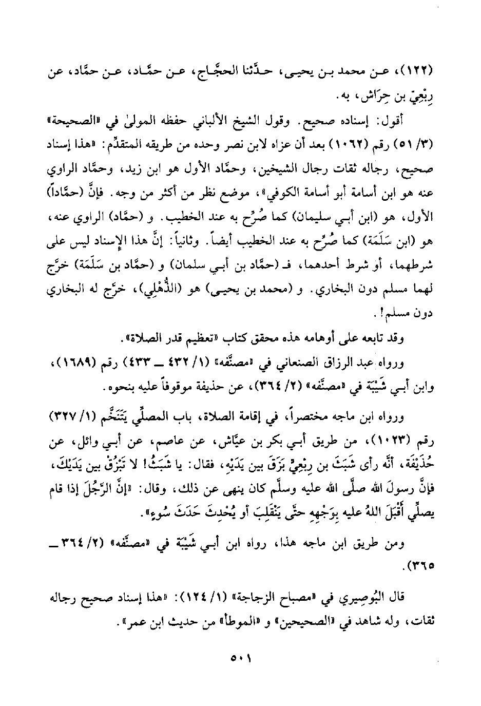 أقول: إسناده صحيح. وقول الشيخ الألباني حفظه المولى في "الصحيحة" (٣/ ٥١) رقم (١٠٦٢) بعد أن عزاه لابن نصر وحده من طريقه المتقدِّم: "هذا إسناد صحيح، رجاله ثقات رجال الشيخين، وحمَّاد الأول هو ابن زيد، وحمَّاد الراوي عنه هو ابن أسامة أبو أسامة الكوفي"، موضع نظر من أكثر من وجه. فإنَّ (حمَّادًا) الأول، هو (ابن أبي سليمان) كما صُرِّح به عند الخطيب. و (حمَّاد) الراوي عنه، هو (ابن سَلَمَة) كما صُرِّح به عند الخطيب أيضًا. وثانيًا: إنَّ هذا الإِسناد ليس على شرطهما، أو شرط أحدهما، فـ (حمَّاد بن أبي سلمان) و (حمَّاد بن سَلَمَة) خرَّج لهما مسلم دون البُخَاري. و (محمد بن يحيى) هو (الذُّهْلِي)، خرَّج له البُخَاري دون مسلم! .