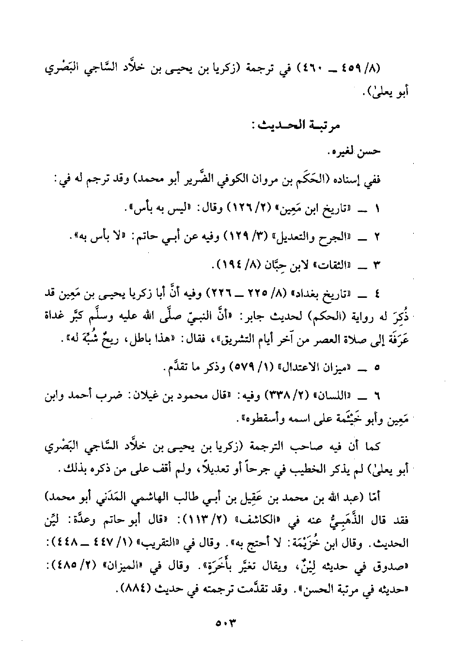 ٤ - "تاريخ بغداد" (٨/ ٢٢٥ - ٢٢٦) وفيه أنَّ أبا زكريا يحيى بن مَعِين قد ذُكِرَ له رواية (الحكم) لحديث جابر: "أنَّ النبيّ صلَّى اللَّه عليه وسلَّم كبَّر غداة عَرَفَة إلى صلاة العصر من آخر أيَّام التشريق"، فقال: "هذا باطل، ريحٌ شُبِّةَ له".