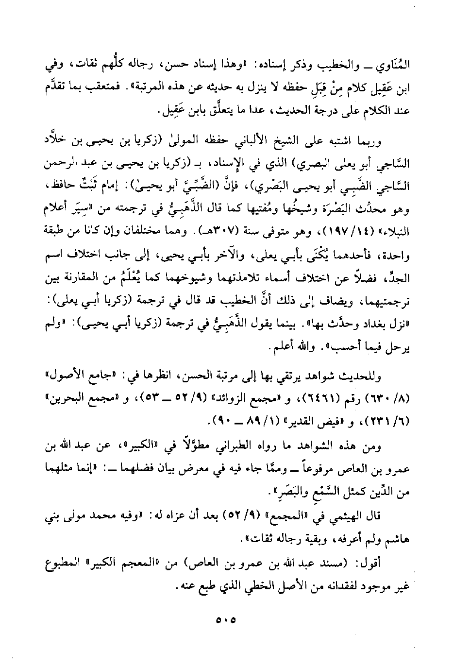 وربما اشتبه على الشيخ الألباني حفظه المولى (زكريا بن يحيى بن خلَّاد السَّاجي أبو يعلى البَصْري) الذي في الإِسناد، بـ (زكريا بن يحيى بن عبد الرحمن السَّاجي الضَّبِي أبو يحيى البَصْري)، فإنَّ (الضَّبِّيّ أبو يحيى): إمام ثَبْتٌ حافظ، وهو محدِّث البَصْرَة وشيخُها ومُفتيها كما قال الذَّهَبِيُّ في ترجمته من "سِيَر أعلام النبلاء" (١٤/ ١٩٧)، وهو متوفي سنة (٣٠٧ هـ). وهما مختلفان وإن كانا من طبقة واحدة، فأحدهما يُكْنَى بأبي يعلى، والآخر بأبي يحيى، إلى جانب اختلاف اسم الجدِّ، فضلًا عن اختلاف أسماء تلامذتهما وشيوخهما كما يُعْلَمُ من المقارنة بين ترجمتيهما، ويضاف إلى ذلك أنَّ الخطيب قد قال في ترجمة (زكريا أبي يعلى): "نزل بغداد وحدَّث بها". بينما يقول الذَّهَبِيُّ في ترجمة (زكريا أبي يحيى): ولم يرحل فيما أحسب". واللَّه أعلم.