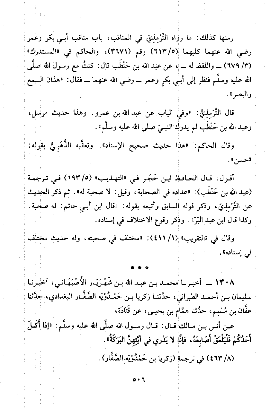 ١٣٠٨ - أخبرنا محمد بن عبد اللَّه بن شَهْرَيَار الأَصْبَهَاني، أخبرنا سليمان بن أحمد الطبراني، حدَّثنا زكريا بن حَمْدُوْيَه الصَّفَّار البغدادي، حدَّثنا عفَّان بن مُسْلِم، حدَّثنا همَّام بن يحيى، عن قَتَادة،