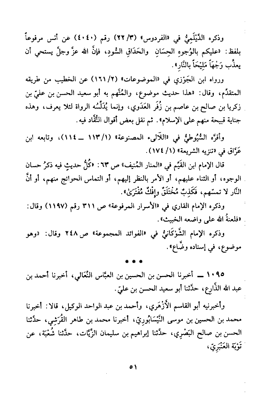 قال الإِمام ابن القَيِّم في "المنار المُنيف" ص ٦٣: "كُلُّ حديثٍ فيه ذكرُ حسان الوجوه، أو الثناء عليهم، أو الأمر بالنظر إليهم، أو التماس الحوائج منهم، أو أنَّ النَّار لا تمسّهم، فَكَذِبٌ مُخْتَلَقٌ وإِفْكٌ مُفْتَرَى".
