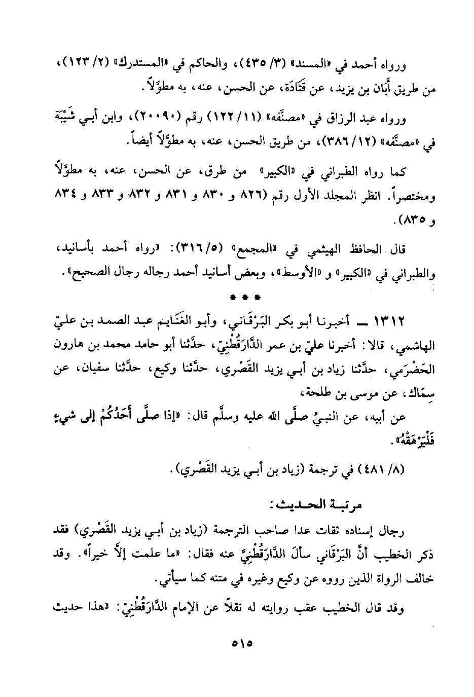 ١٣١٢ - أخبرنا أبو بكر البَرْقَاني، وأبو الغَنَايم عبد الصمد بن عليّ الهاشمي، قال: أخبرنا عليّ بن عمر الدَّارَقُطْنِيّ، حدَّثنا أبو حامد محمد بن هارون الحَضْرَمي، حدَّثنا زياد بن أبي يزيد القَصْري، حدَّثنا وكيع، حدَّثنا سفيان، عن سِمَاك، عن موسى بن طلحة،
