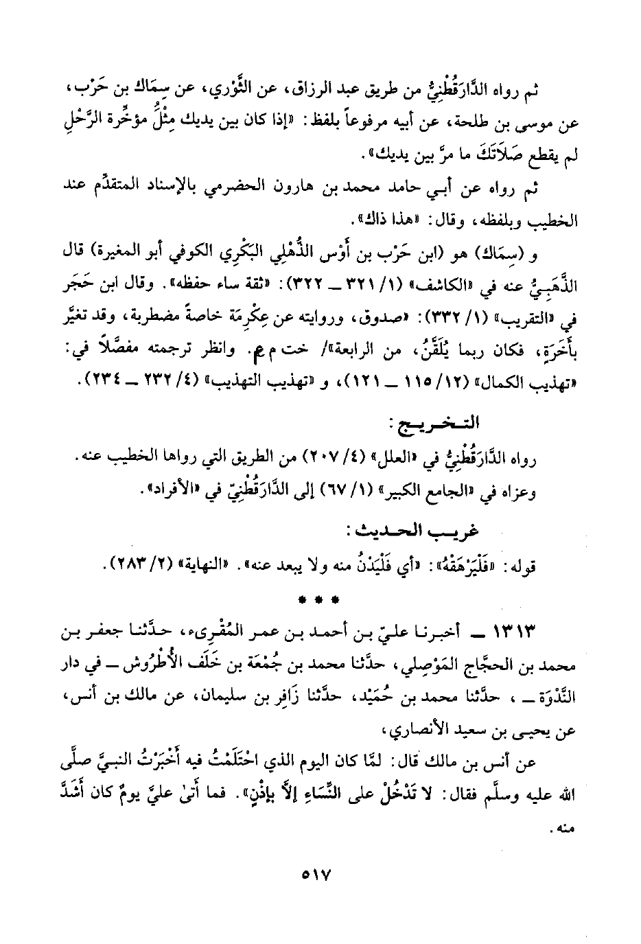 ثم رواه الدَّارَقُطْنِيُّ من طريق عبد الرزاق، عن الثَّوْري، عن سِمَاك بن حَرْب، عن موسى بن طلحة، عن أبيه مرفوعًا بلفظ: "إذا كان بين يديك مِثْلُّ مؤخِّرة الرَّحْلِ لم يقطع صَلَاتَكَ ما مرَّ بين يديك".