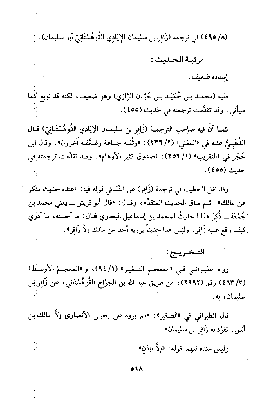 كما أنَّ فيه صاحب الترجمة (زَافِر بن سليمان الإيَادي القُوهُسْتَانِيّ) قال الذَّهبِيَّ عنه في "المغني" (٢/ ٢٣٦): "وثَّقه جماعة وضعَّفه آخرون". وقال ابن حَجَر في "التقريب" (١/ ٢٥٦): "صدوق كثير الأوهام". وقد تقدَّمت ترجمته في حديث (٤٥٥).