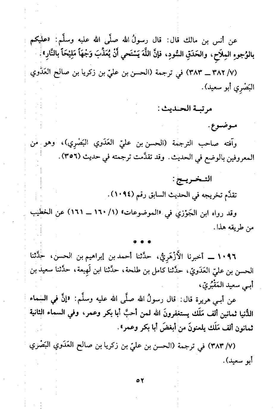 ١٠٩٦ - أخبرنا الأَزْهَرِيُّ، حدَّثنا أحمد بن إبراهيم بن الحسن، حدَّثنا الحسن بن عليّ العَدَوي، حدَّثنا كامل بن طلحة، حدَّثنا ابن لَهِيعَة، حدَّثنا سعيد بن أبي سعيد المَقْبُريّ،