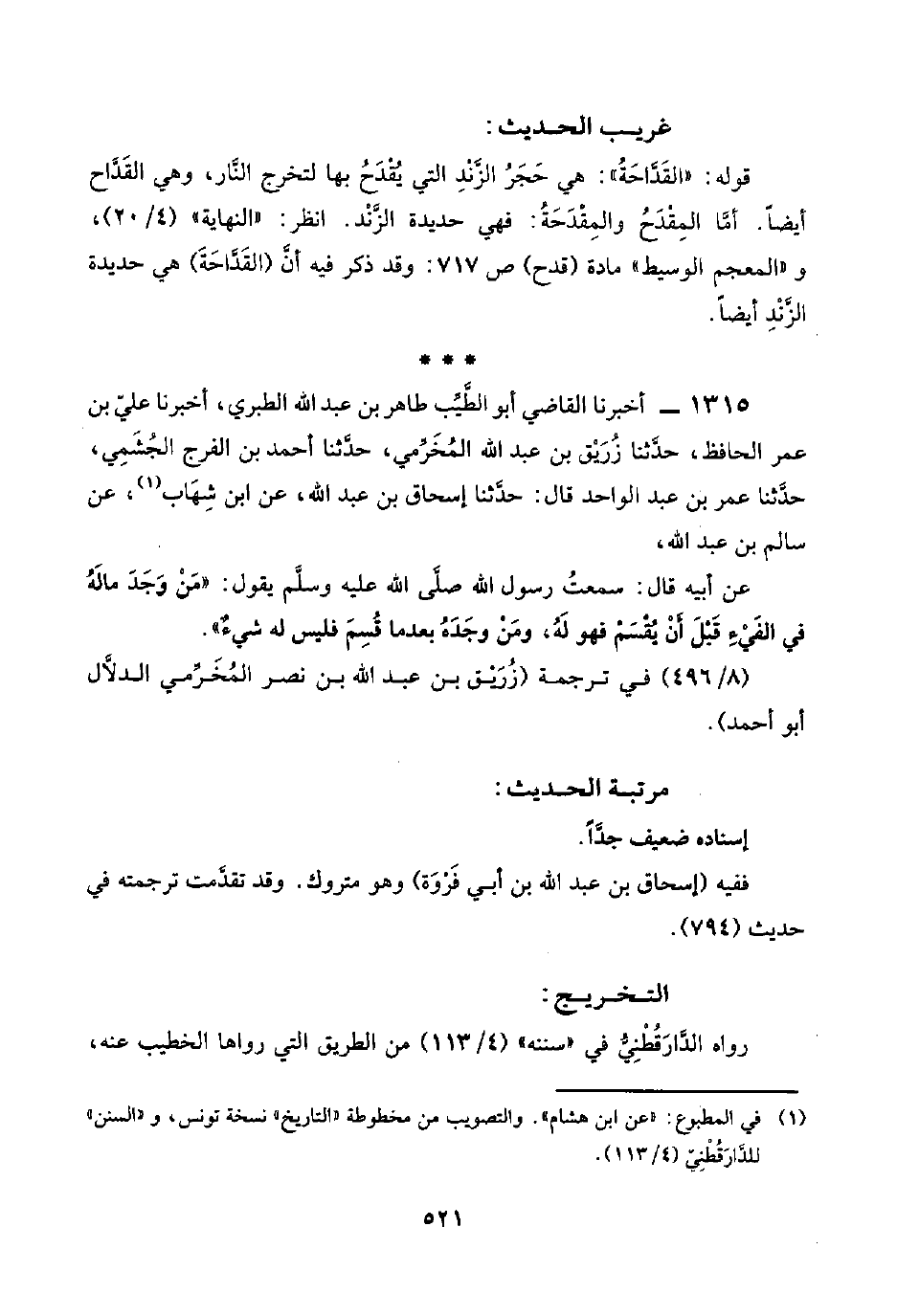 ١٣١٥ - أخبرنا القاضي أبو الطَّيِّب طاهر بن عبد اللَّه الطبري، أخبرنا عليّ بن عمر الحافظ، حدَّثنا زُرَيْق بن عبد اللَّه المُخَرِّمي، حدَّثنا أحمد بن الفرج الجُشَمِي، حدَّثنا عمر بن عبد الواحد قال: حدَّثنا إسحاق بن عبد اللَّه، عن ابن شِهَاب (¬١)، عن سالم بن عبد اللَّه،