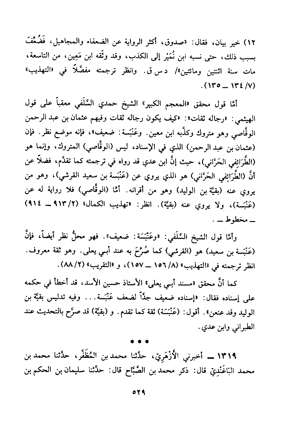 أمَّا قول محقق "المعجم الكبير" الشيخ حمدي السَّلَفي معقبًا على قول الهيثمي: "رجاله ثقات": "كيف يكون رجاله ثقات وفيهم عثمان بن عبد الرحمن الوقَّاصي وهو متروك وكذَّبه ابن معين. وعَنْبَسة: ضعيف"، فإنه موضع نظر. فإن (عثمان بن عبد الرحمن) الذي في الإسناد، ليس (الوقَّاصي) المتروك، وإنما هو (الطَّرَائِفي الحَرَّاني)، حيث إنَّ ابن عدي قد رواه في ترجمته كما تقدَّم، فضلًا عن أنَّ (الطَّرَائِفي الحَرَّاني) هو الذي يروي عن (عَنْبَسة بن سعيد القرشي)، وهو من يروي عنه (بقيَّة بن الوليد) وهو من أقرانه. أمَّا (الوقَّاصي) فلا رواية له عن (عَنْبَسة)، ولا يروي عنه (بقيَّة). انظر: "تهذيب الكمال" (٢/ ٩١٣ - ٩١٤) -مخطوط-.