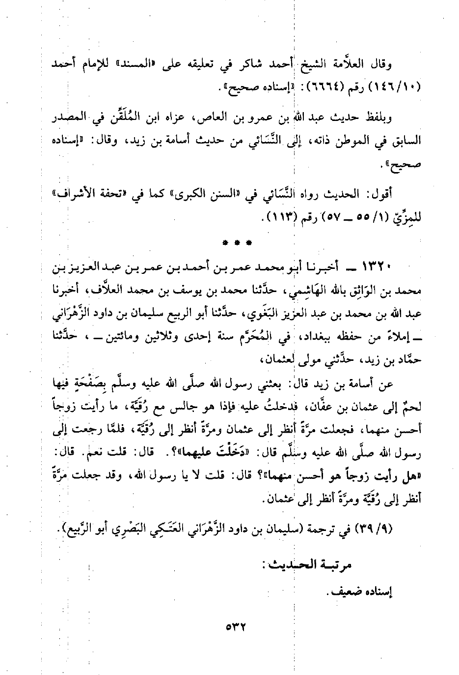 ١٣٢٠ - أخبرنا أبو محمد عمر بن أحمد بن عمر بن عبد العزيز بن محمد بن الوَاثِق باللَّه الهَاشِمي، حدَّثنا محمد بن يوسف بن محمد العلَّاف، أخبرنا عبد اللَّه بن محمد بن عبد العزيز البَغَوي، حدَّثنا أبو الربيع سليمان بن داود الزَّهْرَاني -إملاءً من حفظه ببغداد، في المُحَرَّم سنة إحدى وثلاثين ومائتين-، حدَّثنا حمَّاد بن زيد، حدَّثني مولى لعثمان،