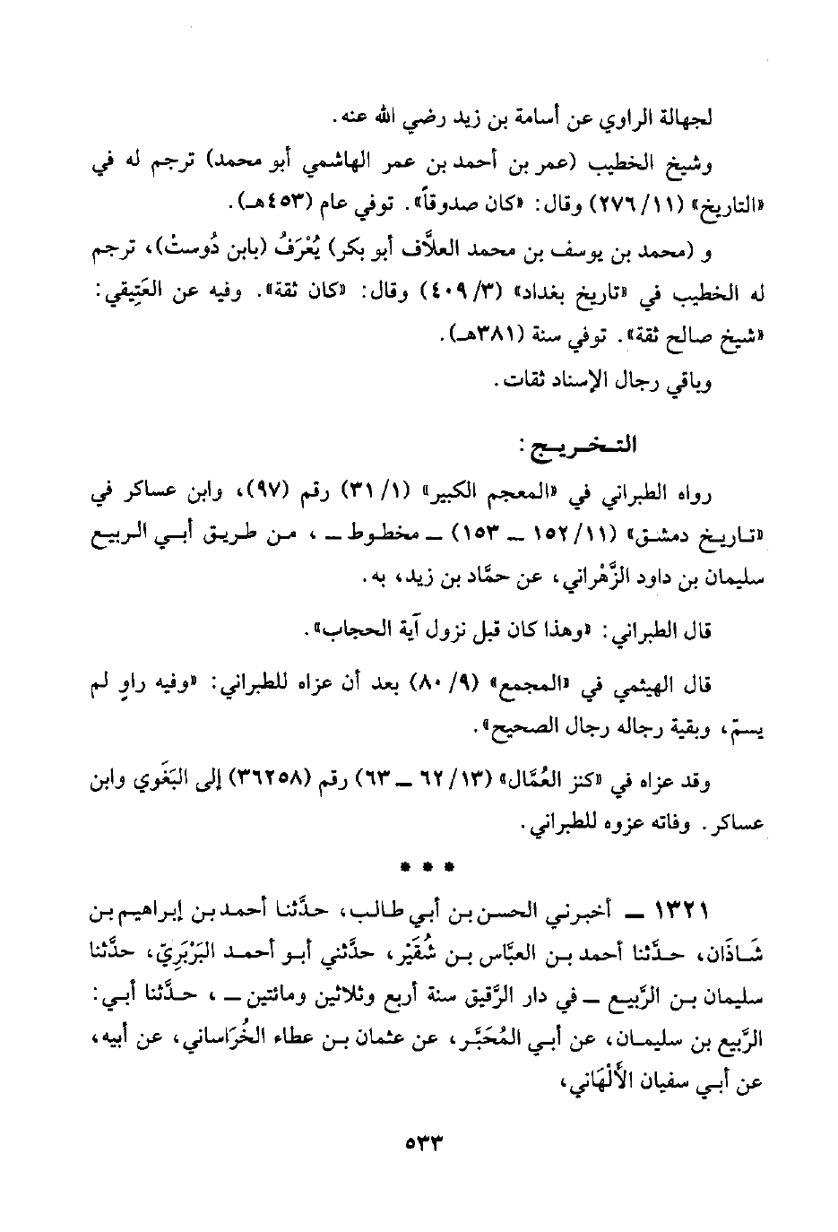 ١٣٢١ - أخبرني الحسن بن أبي طالب، حدَّثنا أحمد بن إبراهيم بن شَاذَان، حدَّثنا أحمد بن العبَّاس بن شُقَيْر، حدَّثني أبو أحمد البَرْبَرِيّ، حدَّثنا سليمان بن الرَّبيع -في دار الرَّقيق سنة أربع وثلاثين ومائتين-، حدَّثنا أبي: الرَّبيع بن سليمان، عن أبي المُحَبَّر، عن عثمان بن عطاء الخُرَاساني، عن أبيه، عن أبي سفيان الأَلْهَاني،