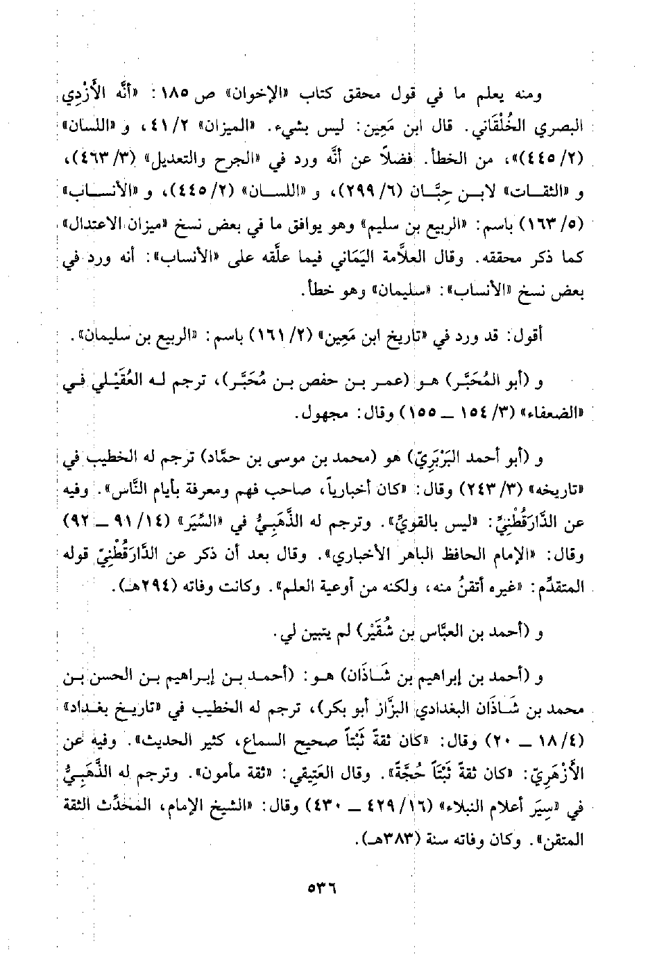 ومنه يعلم ما في قول محقق كتاب "الإخوان" ص ١٨٥: "أنَّه الأَزْدِي البَصْرِي الخُلْقَاني. قال ابن مَعِين: ليس بشيء. "الميزان" ٢/ ٤١، و"اللسان" (٢/ ٤٤٥) "، من الخطأ. فضلًا عن أنَّه ورد في "الجرح والتعديل" (٣/ ٤٦٣)، و"الثقات" لابن حِبَّان (٦/ ٢٩٩)، و"اللسان" (٢/ ٤٤٥)، و"الأنساب" (٥/ ١٦٣) بأسم: "الربيع بن سليم" وهو يوافق ما في بعض نسخ "ميزان الاعتدال" كما ذكر محققه. وقال العلَّامة اليَمَاني فيما علَّقه على "الأنساب": أنَّه ورد في بعض نسخ "الأنساب": "سليمان" وهو خطأ.