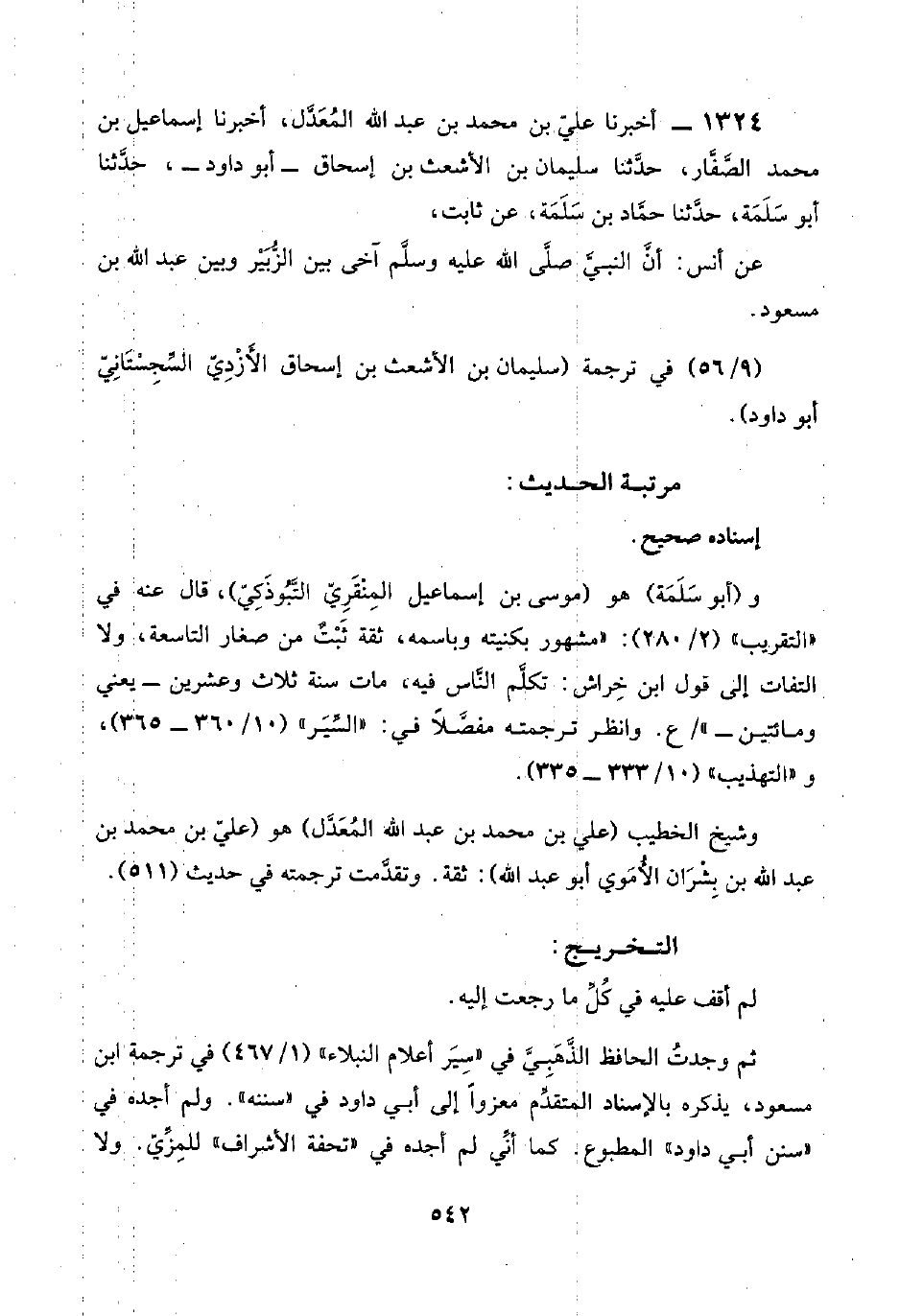 ١٣٢٤ - أخبرنا عليّ بن محمد بن عبد اللَّه المُعَدَّل، أخبرنا إسماعيل بن محمد الصَّفَّار، حدَّثنا سليمان بن الأشعث بن إسحاق -أبو داود-، حدَّثنا أبو سَلَمَة، حدَّثنا حمَّاد بن سَلَمَة، عن ثابت،