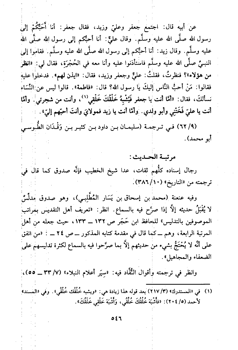 عن أبيه قال: اجتمع جعفر وعليّ وزيد، فقال جعفر: أنا أَحَبُّكُمْ إلى رسول اللَّه صلَّى اللَّه عليه وسلَّم. وقال عليٌّ: أنا أحبُّكم إلى رسول اللَّه صلَّى اللَّه عليه وسلَّم. وقال زيد: أنا أحبُّكم إلى رسول اللَّه صلَّى اللَّه عليه وسلَّم. فقاموا إلى النبيِّ صلَّى اللَّه عليه وسلَّم فاستأذنوا عليه وأنا معه في الحُجْرَةِ، فقال لي: "انظر من هؤلاء"؟ فنظرتُ، فقلتُ: عليٌّ وجعفر وزيد، فقال: "ايذن لهم". فدخلوا عليه فقالوا: مَنْ أحبُّ النَّاس إليكَ يا رسول اللَّه؟ قال: "فاطمة". قالوا ليس عن النِّسَاء نسألك، فقال: "أمَّا أنت يا جعفر فَيُشْبِهُ خَلْقُكَ خَلْقِي (¬١)، وأنت من شجرتي. وأمَّا أنت يا عليّ فَخَتْنِي وأبو ولدي. وأمَّا أنت يا زيد فمولايَ وأنتَ أحبّهم إليّ".