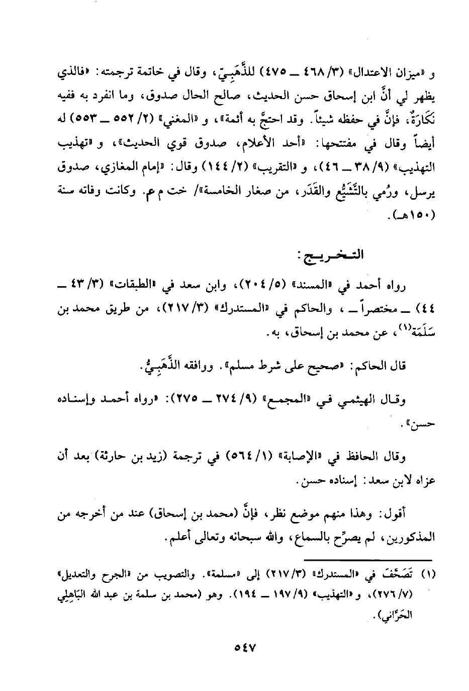 و"ميزان الاعتدال" (٣/ ٤٦٨ - ٤٧٥) للذَّهَبِيّ، وقال في خاتمة ترجمته: "فالذي يظهر لي أنَّ ابن إسحاق حسن الحديث، صالح الحال صدوق، وما انفرد به ففيه نَكَارَةٌ، فإنَّ في حفظه شيئًا. وقد احتجَّ به أئمة"، و"المغني" (٢/ ٥٥٢ - ٥٥٣) له أيضًا وقال في مفتتحها: "أحد الأعلام، صدوق قوي الحديث"، و"تهذيب التهذيب" (٩/ ٣٨ - ٤٩)، و"التقريب" (٢/ ١٤٤) وقال: "إمام المغازي، صدوق يرسل، ورُمي بالتَّشَيُّع والقَدَر، من صغار الخامسة"/ خت م ٤. وكانت وفاته سنة (١٥٠ هـ).