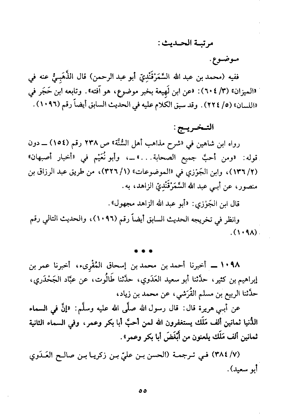 رواه ابن شاهين في "شرح مذاهب أهل السُّنَّة" ص ٢٣٨ رقم (١٥٤) -دون قوله: "ومن أحبَّ جميع الصحابة. . . "-، وأبو نُعَيْم في "أخبار أصبهان" (٢/ ١٣٦)، وابن الجَوْزي في "الموضوعات" (١/ ٣٢٦)، من طريق عبد الرزاق بن منصور، عن أبي عبد اللَّه السَّمَرْقَنْدِيّ الزاهد، به.